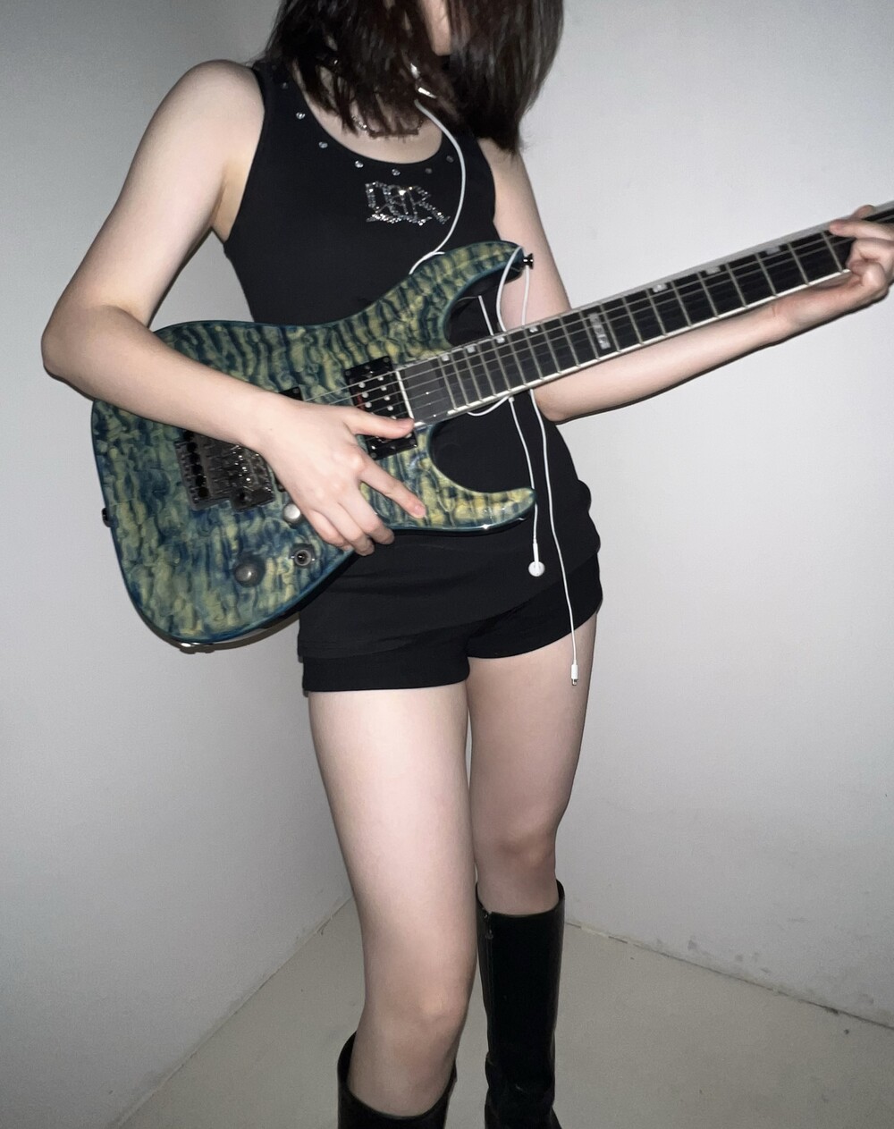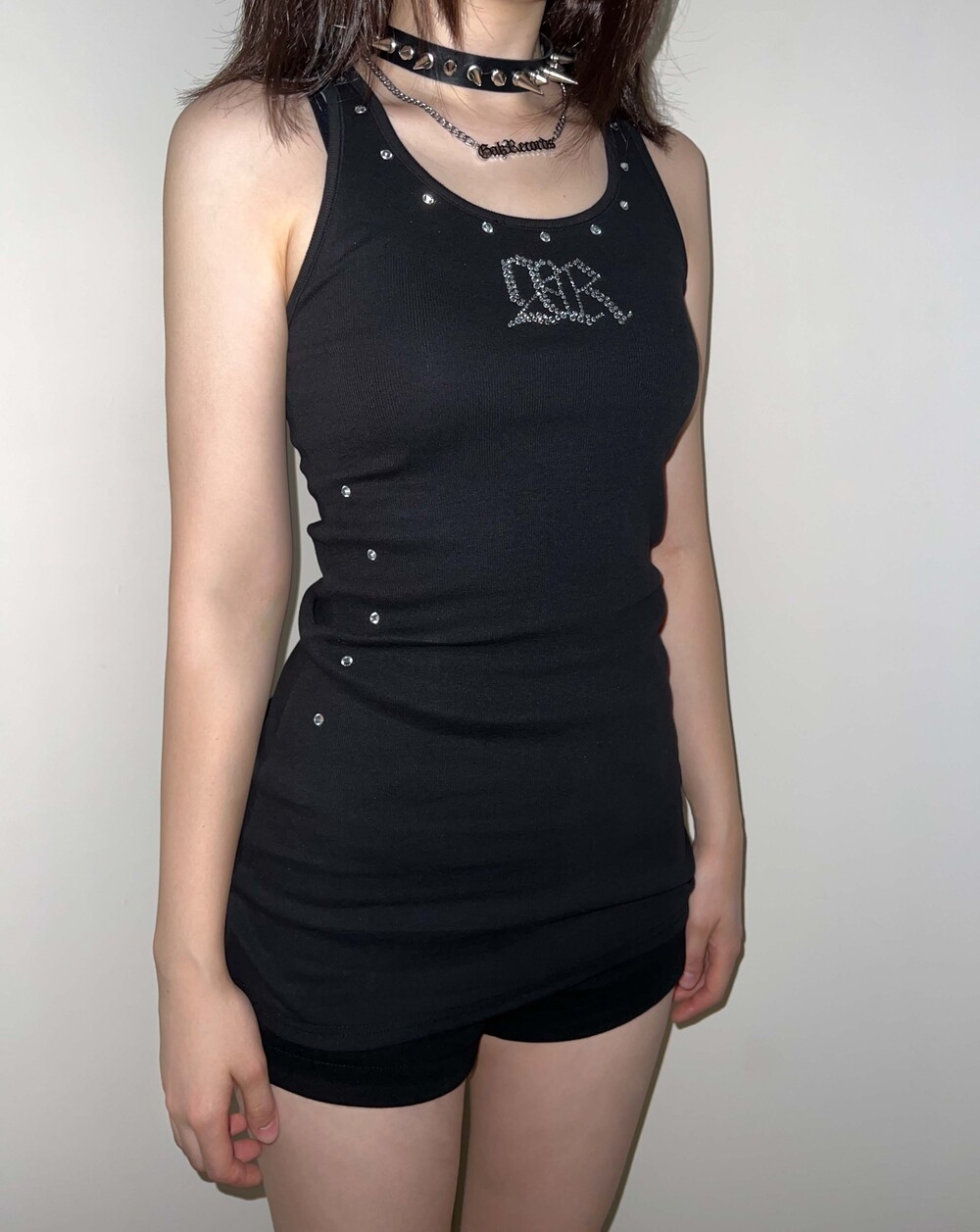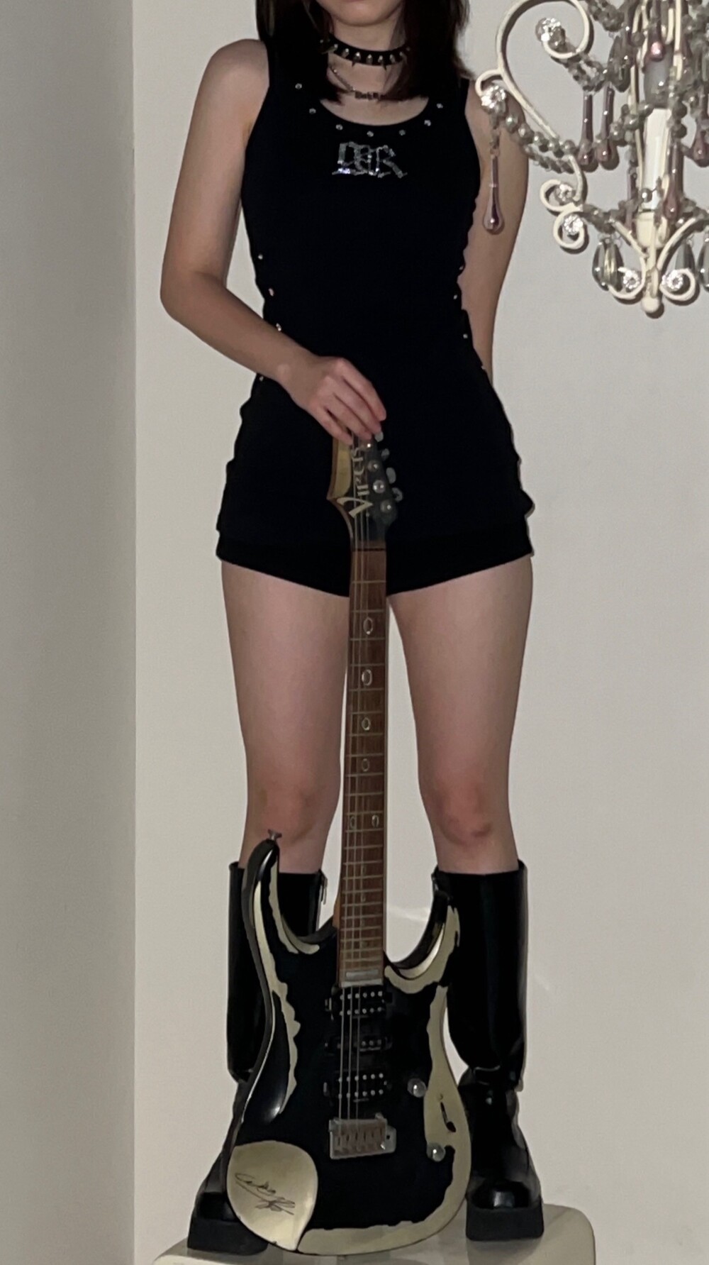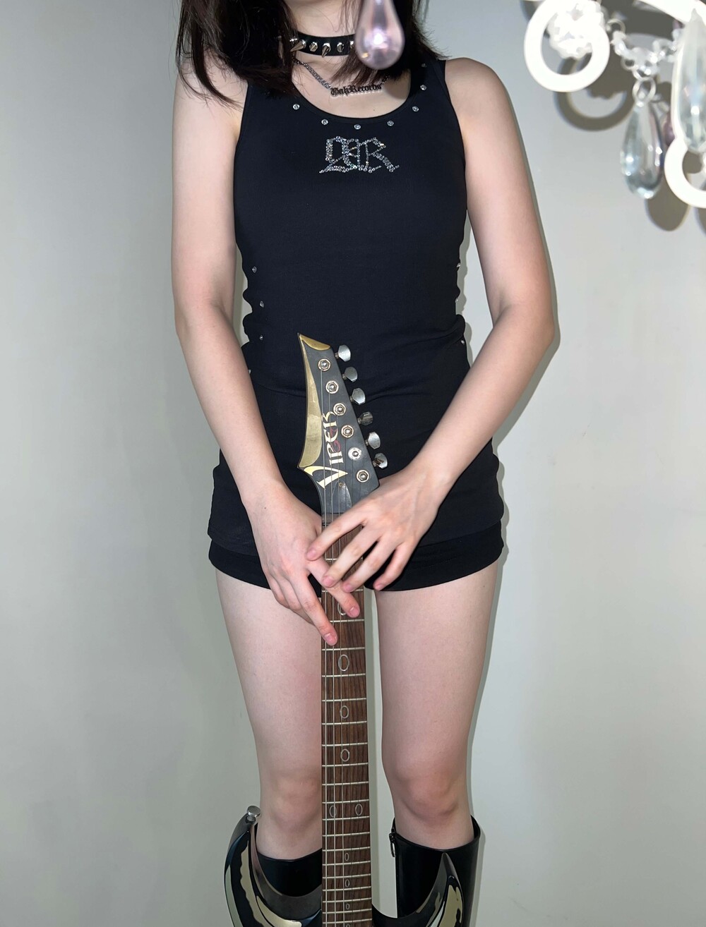 넥, 가슴 중앙, 허리 부분의 반짝이는 핫픽스 스톤 디테일이 포인트가 되면서 라인, 곡선감을 강조하여 더욱 슬림해보이는 핏을 연출합니다.