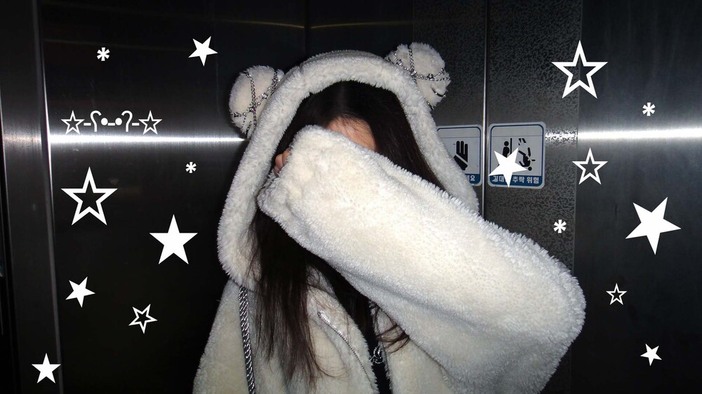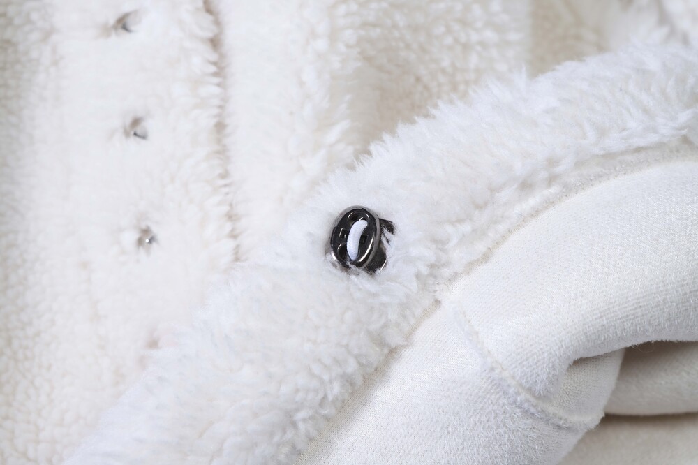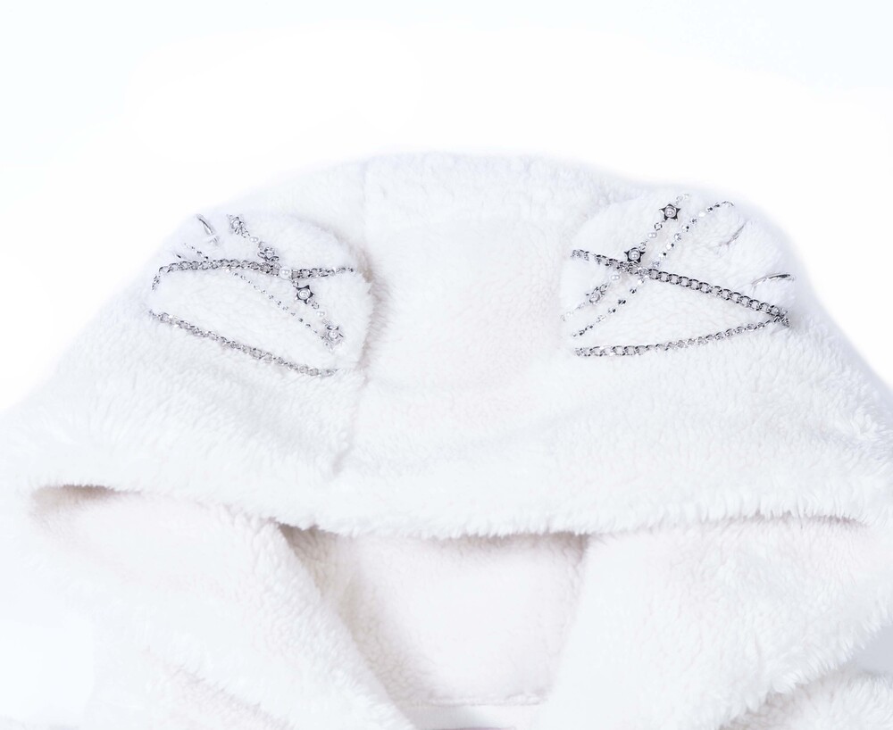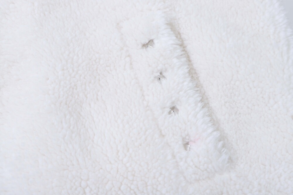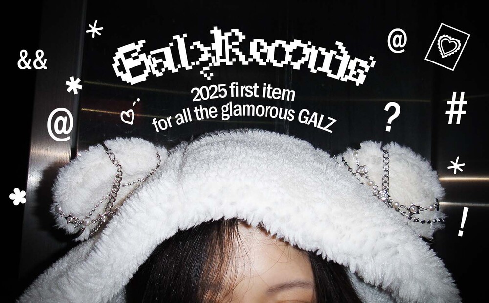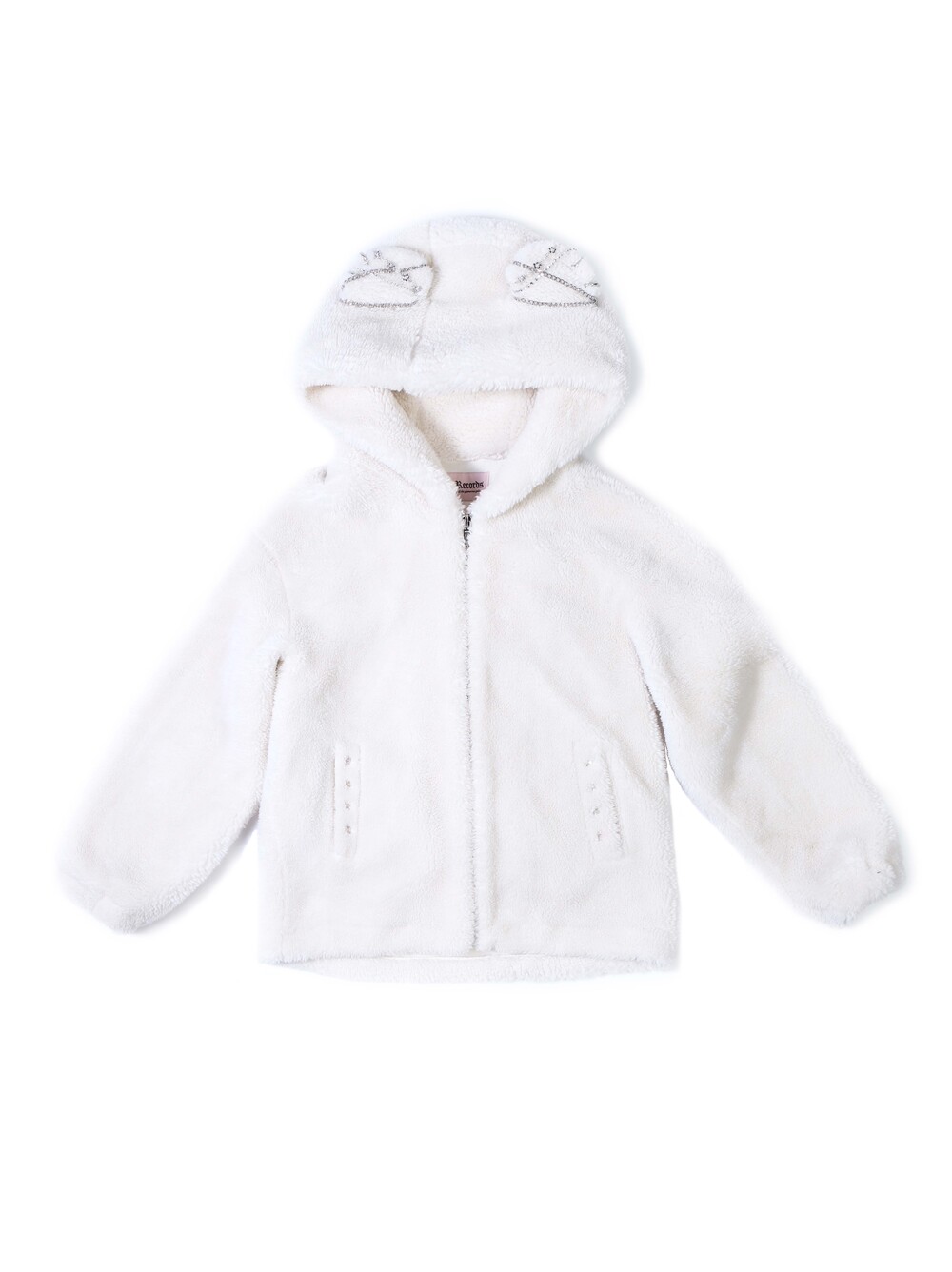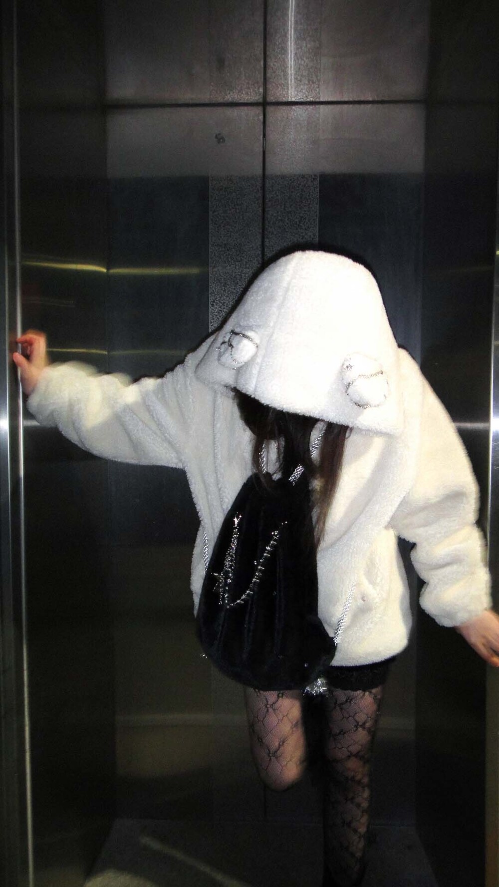 사랑스러운 곰돌이 귀와 부드러운 양털 위의 메탈릭 디테일들이 포인트인 걸즈레코즈의 퍼 후드 자켓입니다.