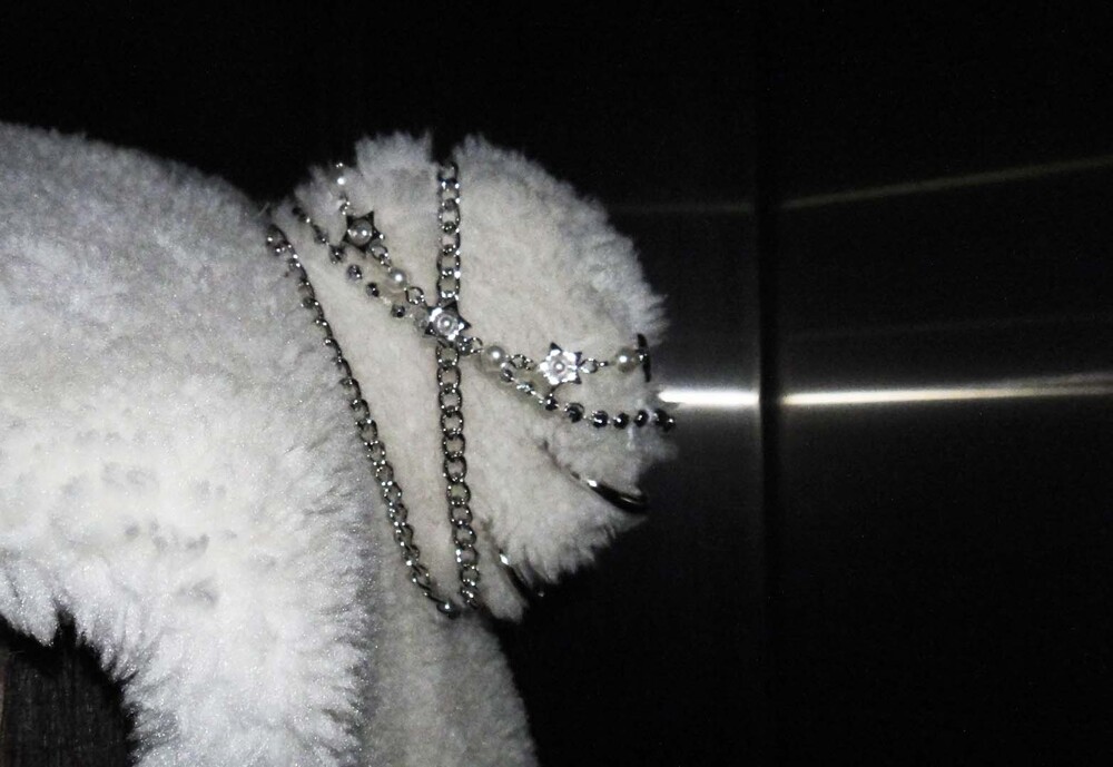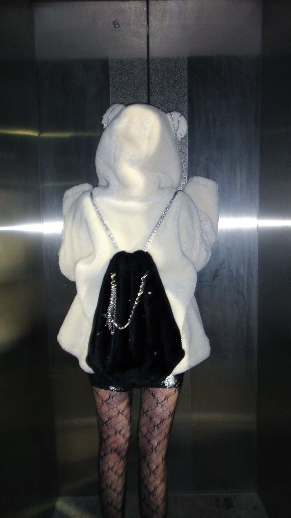 전체적으로 귀엽고 유니크한 쉐입에 쿨한 매력을 더하는 귀의 체인 디테일은 100% 수작업 스티칭으로 완성되었으며, 피어싱 디테일과 포켓의 리벳 스터드 포인트 역시 걸즈레코즈의 메탈릭 무드를 돋보이게 하는 포인트입니다.