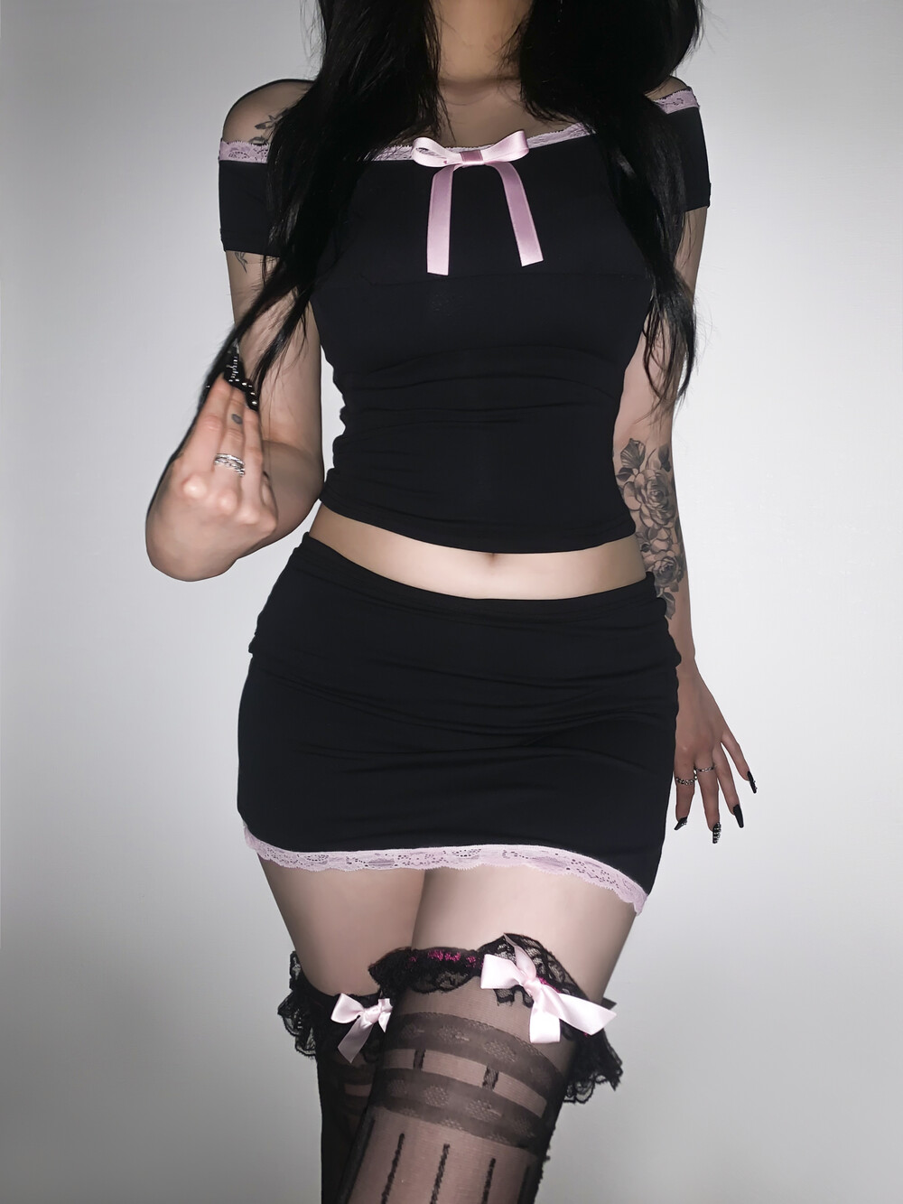블랙과 핑크, 리본, 레이스 등의 디테일들을 통해 Galzrecords만의 baddie- GAL 무드를 셋업으로, 완성도 높게 즐기실 수 있는 아이템입니다.