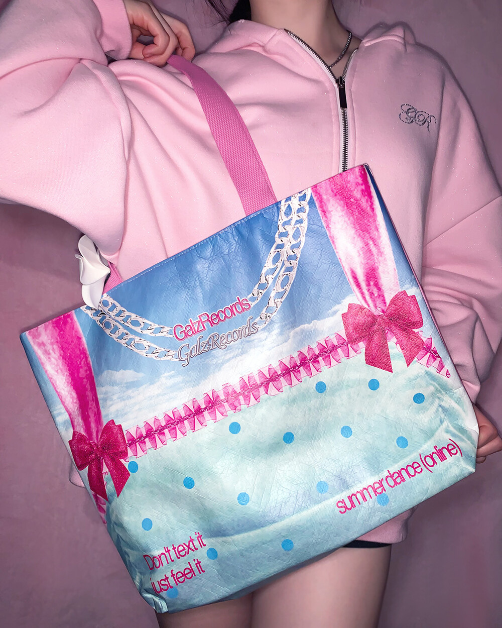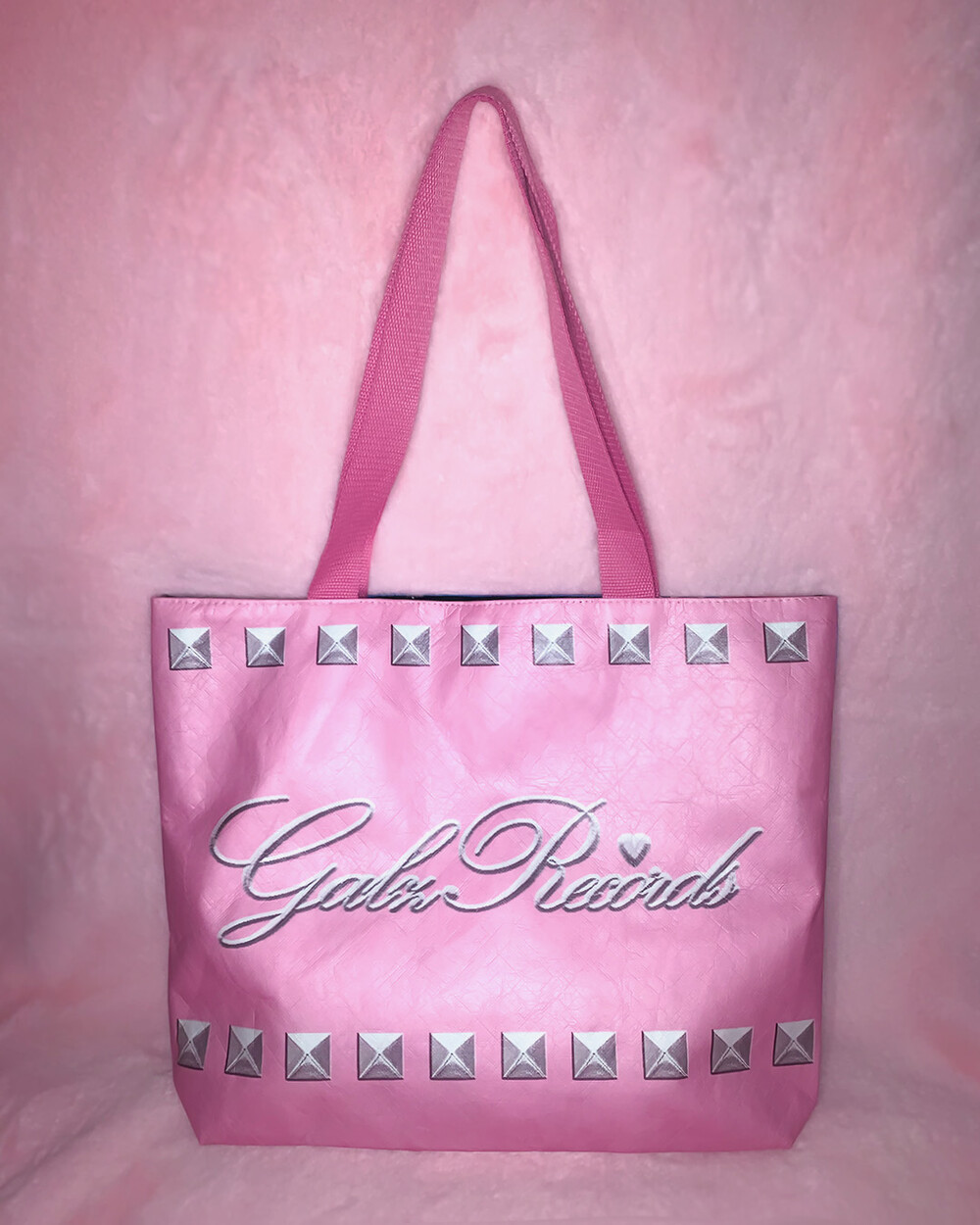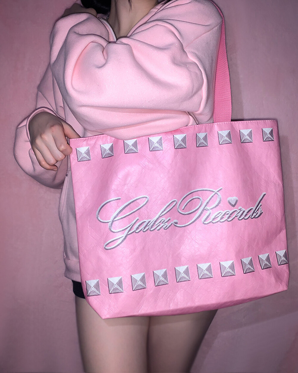 Galzrecords의 쿨하고 사랑스러운 사이버 노스텔지아 무드가 담긴 슈가백입니다. 핑크 베이스의 원 디자인, 투 스타일 백으로 한 면은 뉴 시즌 summer dance(online) 그래픽, 한 면은 핑크, 메탈릭 로고와 스터드 디자인으로 높은 스타일링 활용도가 매력적인 아이템입니다.
