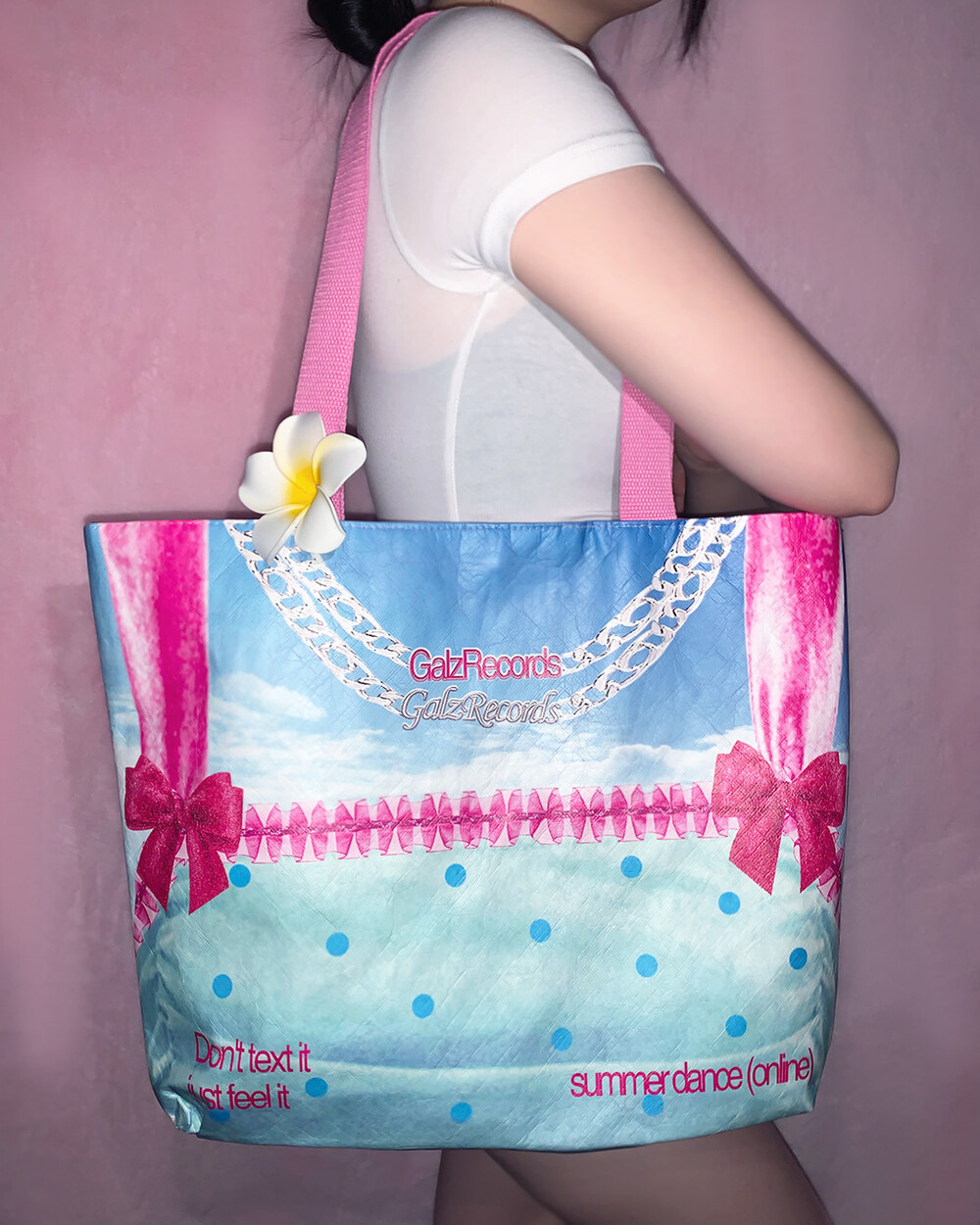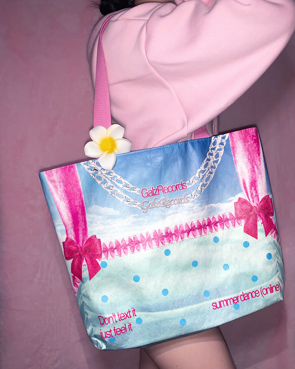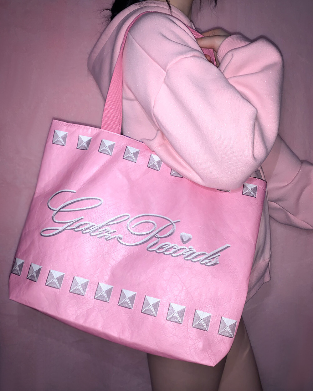 Galzrecords의 쿨하고 사랑스러운 사이버 노스텔지아 무드가 담긴 슈가백입니다. 핑크 베이스의 원 디자인, 투 스타일 백으로 한 면은 뉴 시즌 summer dance(online) 그래픽, 한 면은 핑크, 메탈릭 로고와 스터드 디자인으로 높은 스타일링 활용도가 매력적인 아이템입니다.